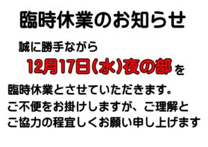 全店舗、臨時休業のお知らせ 2025年12月12日 誠に勝手ながら 全店舗、12月17日(水)夜の部 を 臨時休業とさせていただきます。 ご不便をお掛けしますが、ご理解と ご協力の程宜しくお願い申し上げます。 お知らせ