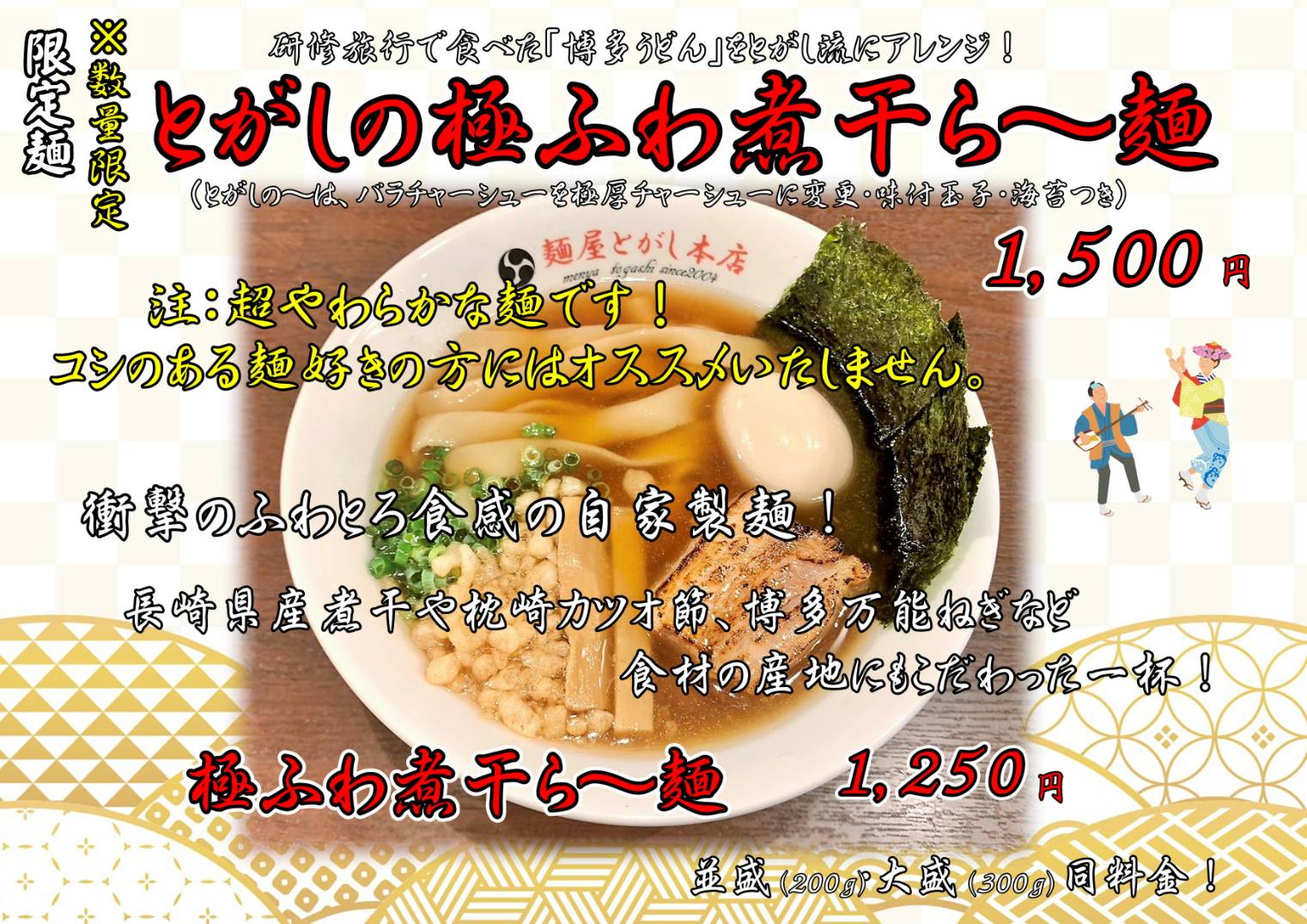 こんにちは! 本店 駿です! 今回は全力を詰め込みました😏 10月の限定はこちらです!! ◯商品名 「とがしの極ふわ煮干ら~麺」 「極ふわ煮干ら~麺」  …