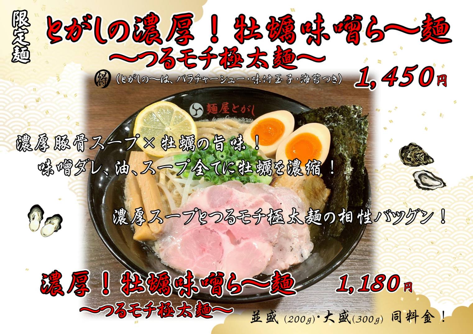 いつもお世話になっております! 本店の駿です🌝 12月に入り、冬が本格化するタイミングで冬にぴったりの一杯を販売致します! ・商品名 【とがしの濃厚!牡蠣味噌ら~麺 ~つるモチ…