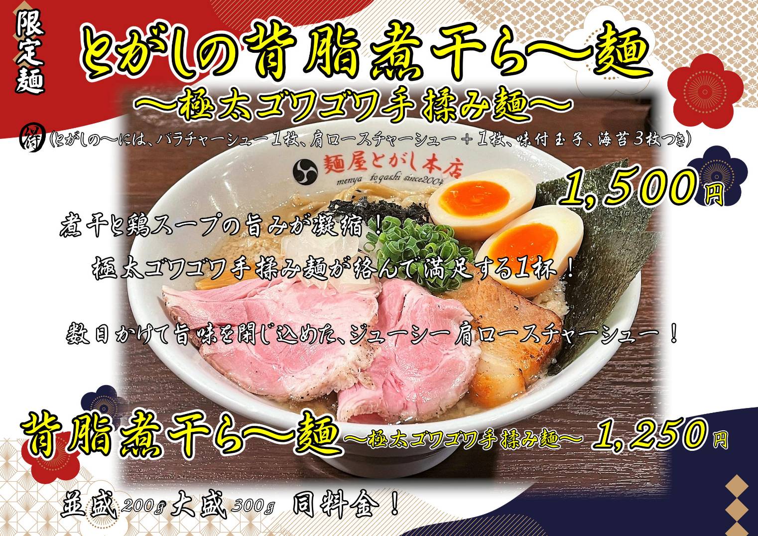 こんにちは! 本店 野坂です! 限定麺スタートします! ⚪︎商品名、価格 とがしの背脂煮干ら〜麺 〜極太ゴワゴワ手揉み麺〜 ¥1500 背脂煮干ら〜麺 〜極太ゴワゴ…