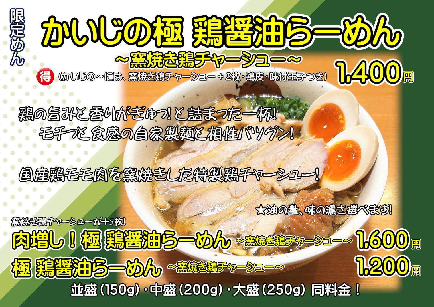 こんばんわ。 デラでございます❤️🔥 かいじ利府店の限定めんの詳細です!!!! ・商品名 『かいじの鶏油そば 〜鶏旨ソースがけ〜』 ・価格 ¥1350 肉増し鶏…