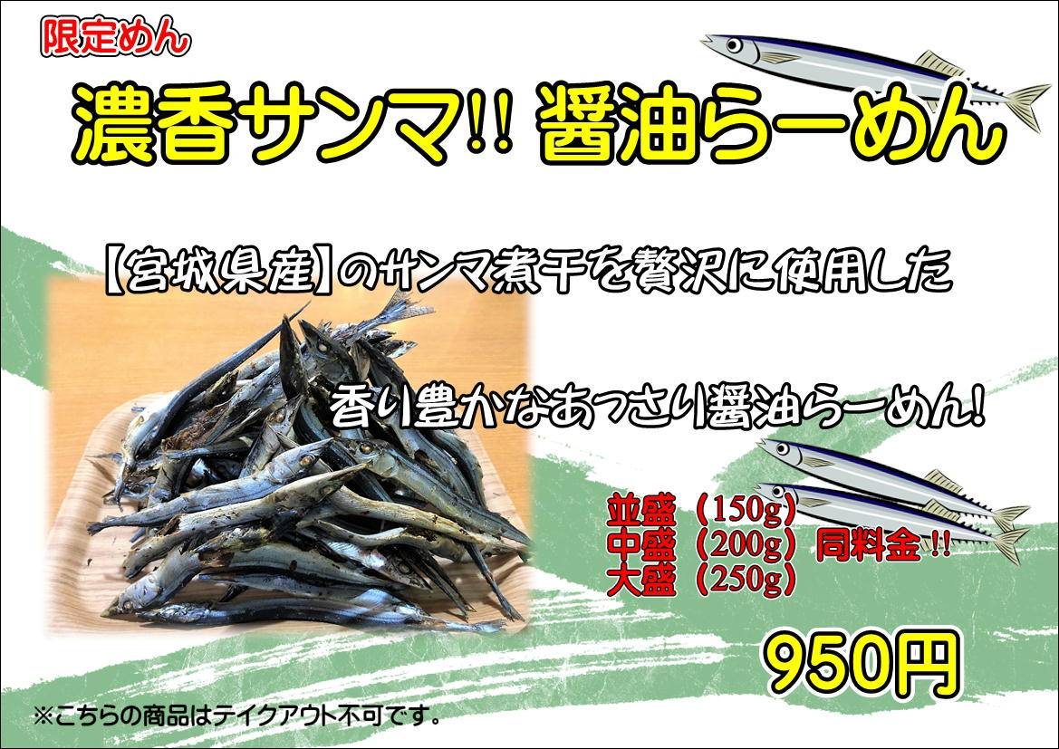 かいじ利府店です! 限定めん『濃香サンマ!!醤油らーめん』の販売がスタートしました! 今回の限定めんは原価ギリギリまで宮城県産のサンマ煮干を贅沢に使用した、とにかくスープにこだわった1杯となっております! 淡麗であっさり…
