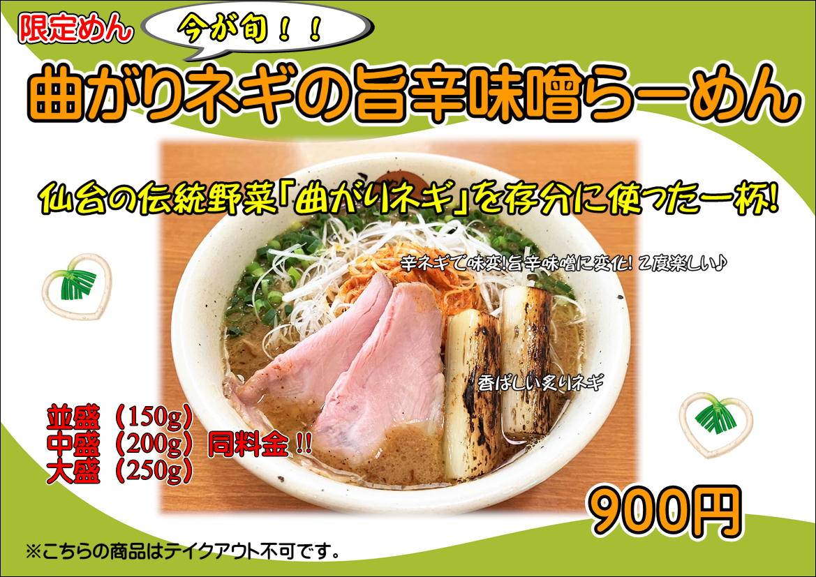 かいじ利府店です! 限定めん 「曲がりネギの旨辛味噌らーめん」 がスタートしました! *販売期間 2週間程度です。 *トッピング 全て曲がりネギを使用した ・白髪ネギ ・辛ネギ ・炙りネギ ・スリムネギ ・豚モモチャーシ…