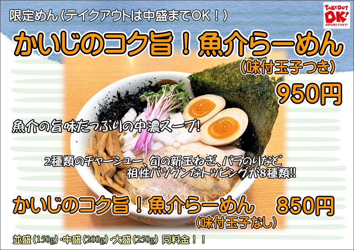 かいじ利府店です! 限定めん かいじの コク旨!魚介らーめん¥950 (味付玉子つき) コク旨!魚介らーめん¥850 スタートしました! 期間→約1ヶ月 時間帯→暫くは夜の部(土日祝は17時から販売)限定。 テイクアウト…